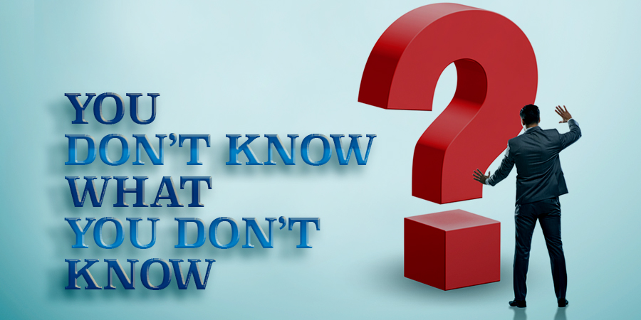 Alt: "You don't know what you don't know" text adjacent to man pondering the existence of a giant question mark.