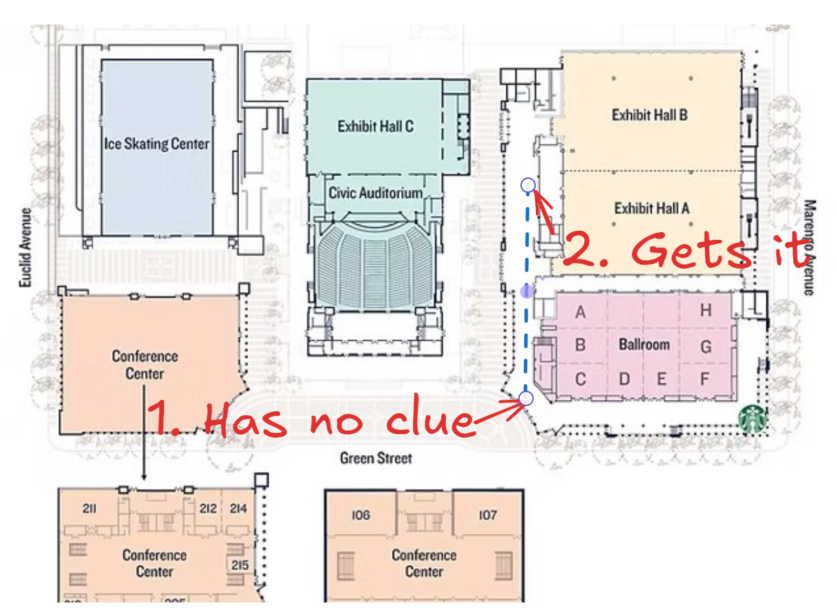 Alt: A map of the Pasadena Conference Center, annotated to demonstrate the approximate distance travelled before realization sets in.